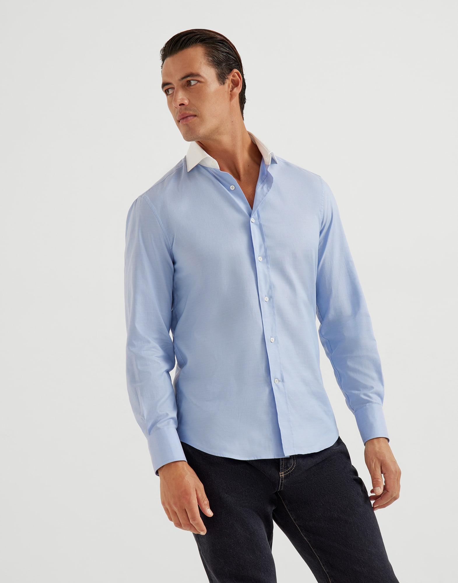 A must-have piece of formal menswear, this cotton Oxford shirt is updated thanks to the detailing of the contrasting white collar. The seasonal hues that color the solid garment enhance its contemporary yet classic style. The shirt's slim fit features close-fitting lines through the chest.