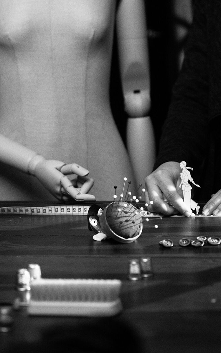 To convey this “magic”, artist and filmmaker Virgilio Villoresi (Fiesole - Florence, 1979) has accurately reconstructed a real tailor’s workshop in his Milan studio, where fabrics, sketches, mannequins, needles and threads come to life and interact in the scene like real actors on stage.