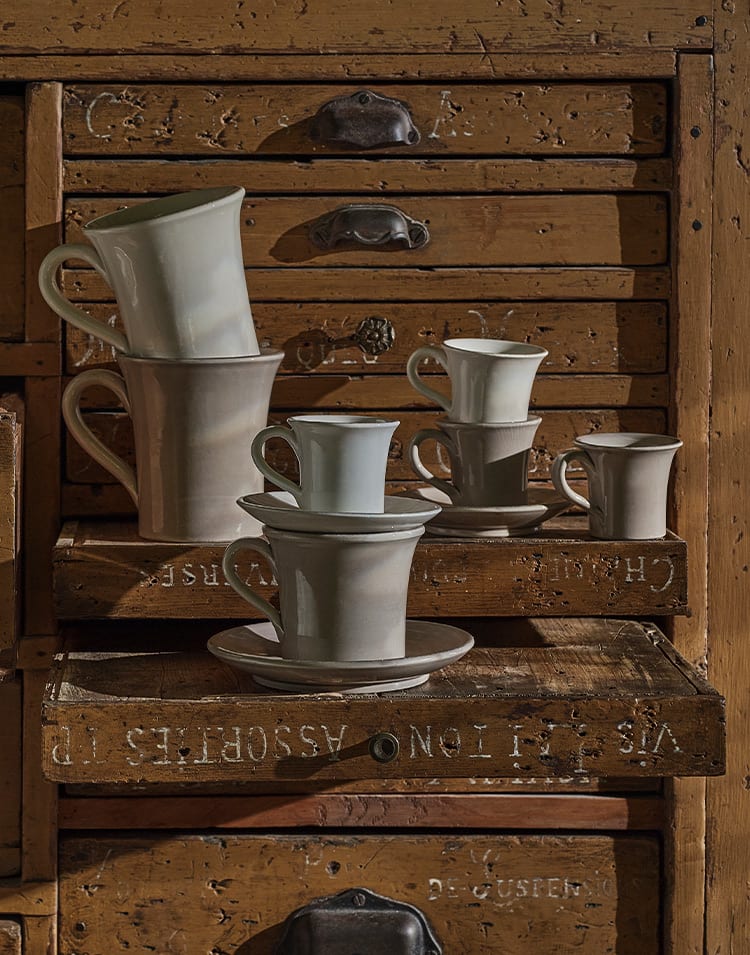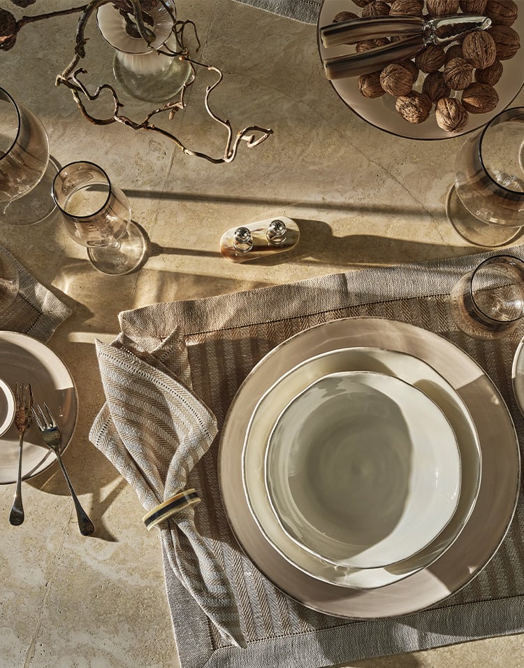 Ceramic design creations reinterpret the art of dining with elegant sets of – flat and soup – plates, saucers, charger plates and bowls. Irregular lines, harmonious colors and handcrafted techniques give uniqueness and warmth to every convivial gesture.