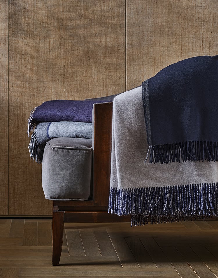 Cashmere, vicuña or silk throws and blankets reinterpret home elegance with light and sophisticated softness. Knitted or linen fabrics and precious textures turn every peaceful moment into a gesture of pure comfort.
