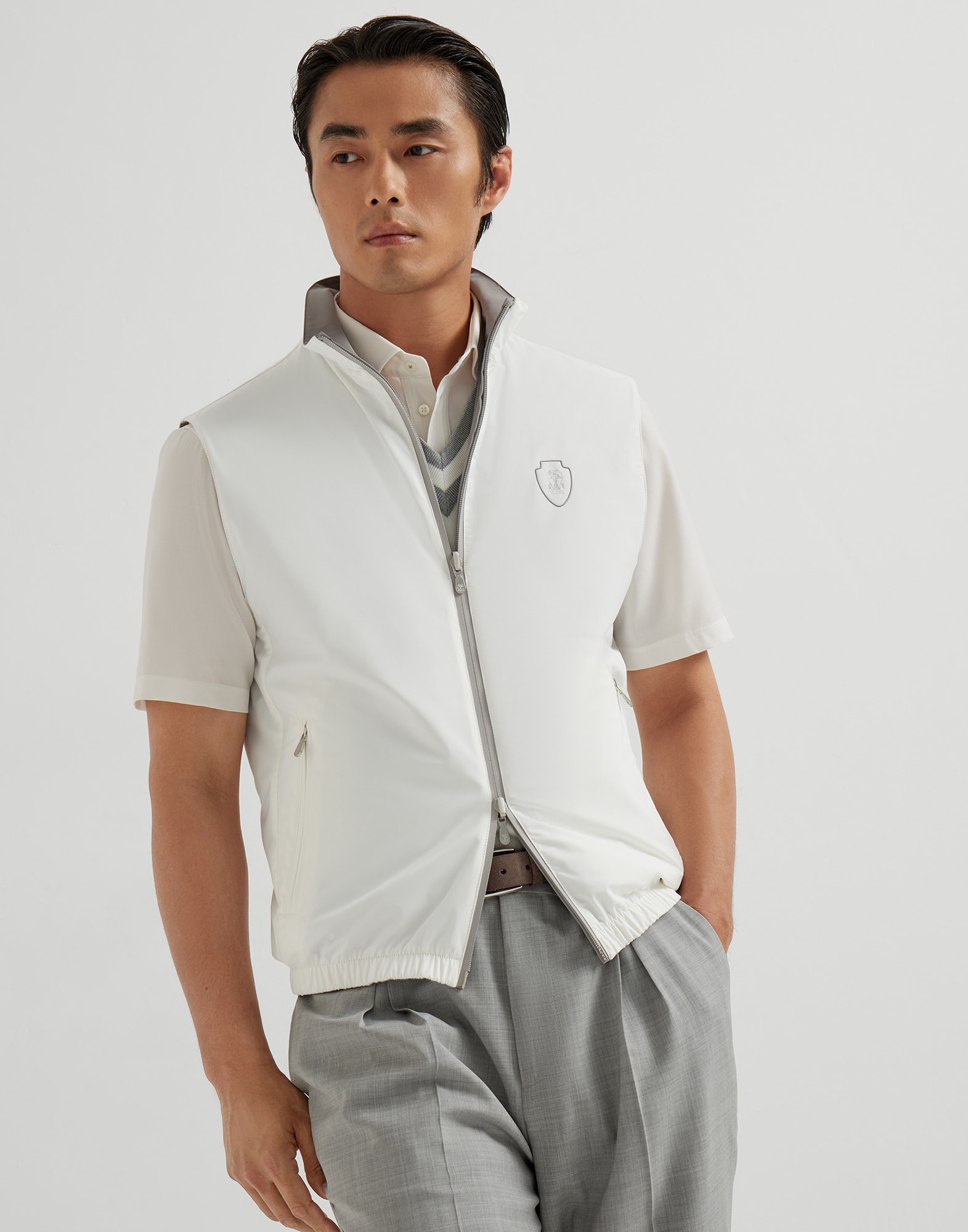 The excellence of Brunello Cucinelli materials is paired with the natural sophistication of the world of Golf in this bonded nylon vest. Delivered in a reversible version in the season’s colors, the garment is made of a lightweight, technical material with a smooth hand that features a rich, matte texture. The zipper closure and side pockets complete the style with practical details, while the heraldic logo on the chest adds a personalized note.