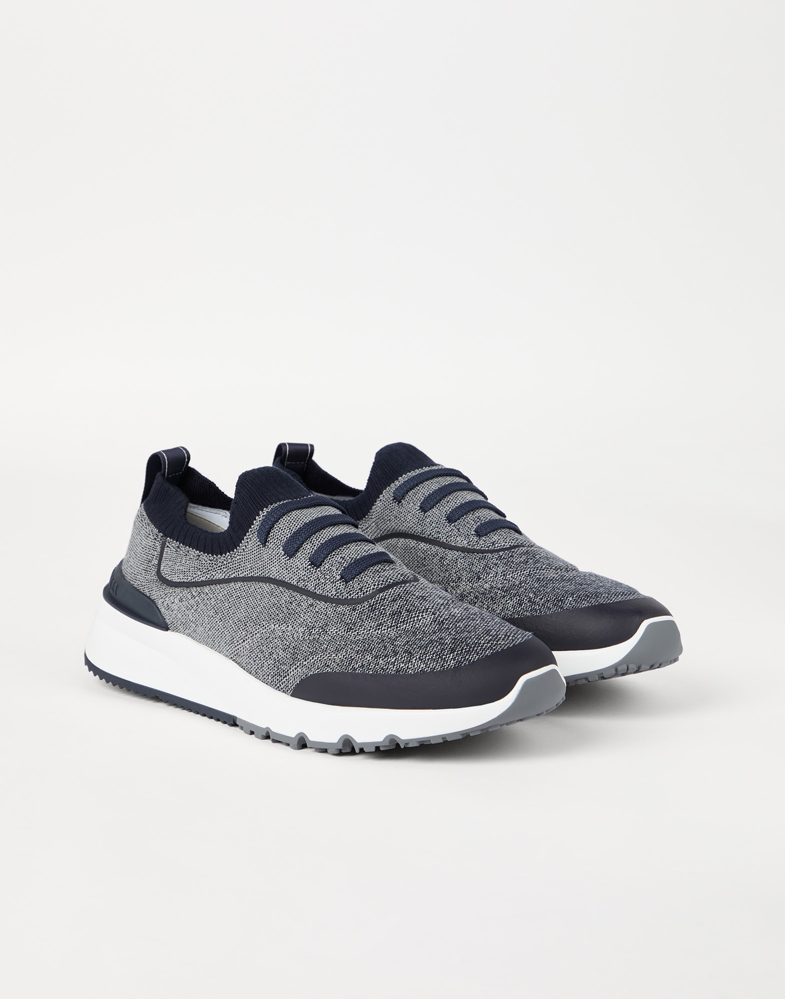 Inspired by the refined yarns of Brunello Cucinelli knitwear, these new techno cotton knit runners update the feel of classic styles in a contemporary way. The heat-sealed trim stands out next to the fine, comfortable appearance of the knit: this sophisticated combination creates an elegant texture contrast.