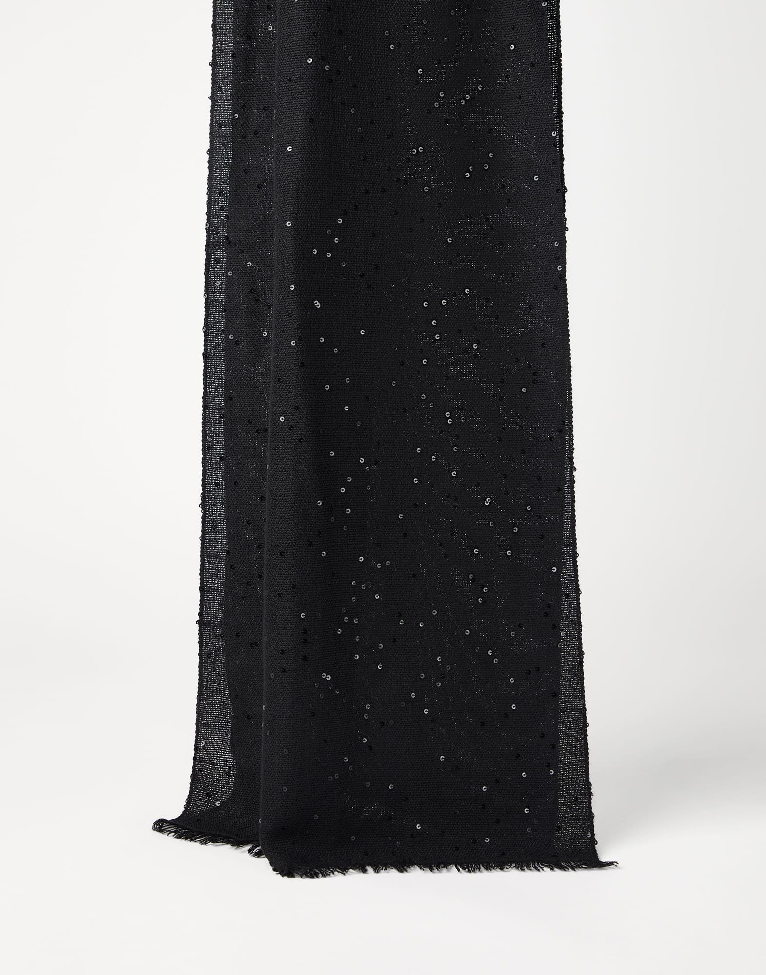 The excellence of Brunello Cucinelli materials and craftsmanship elevate the style of this scarf with a sophisticated touch. Small paillettes enrich the cashmere and silk Diamond yarn’s soft and lightweight texture with precious sparkling reflections.