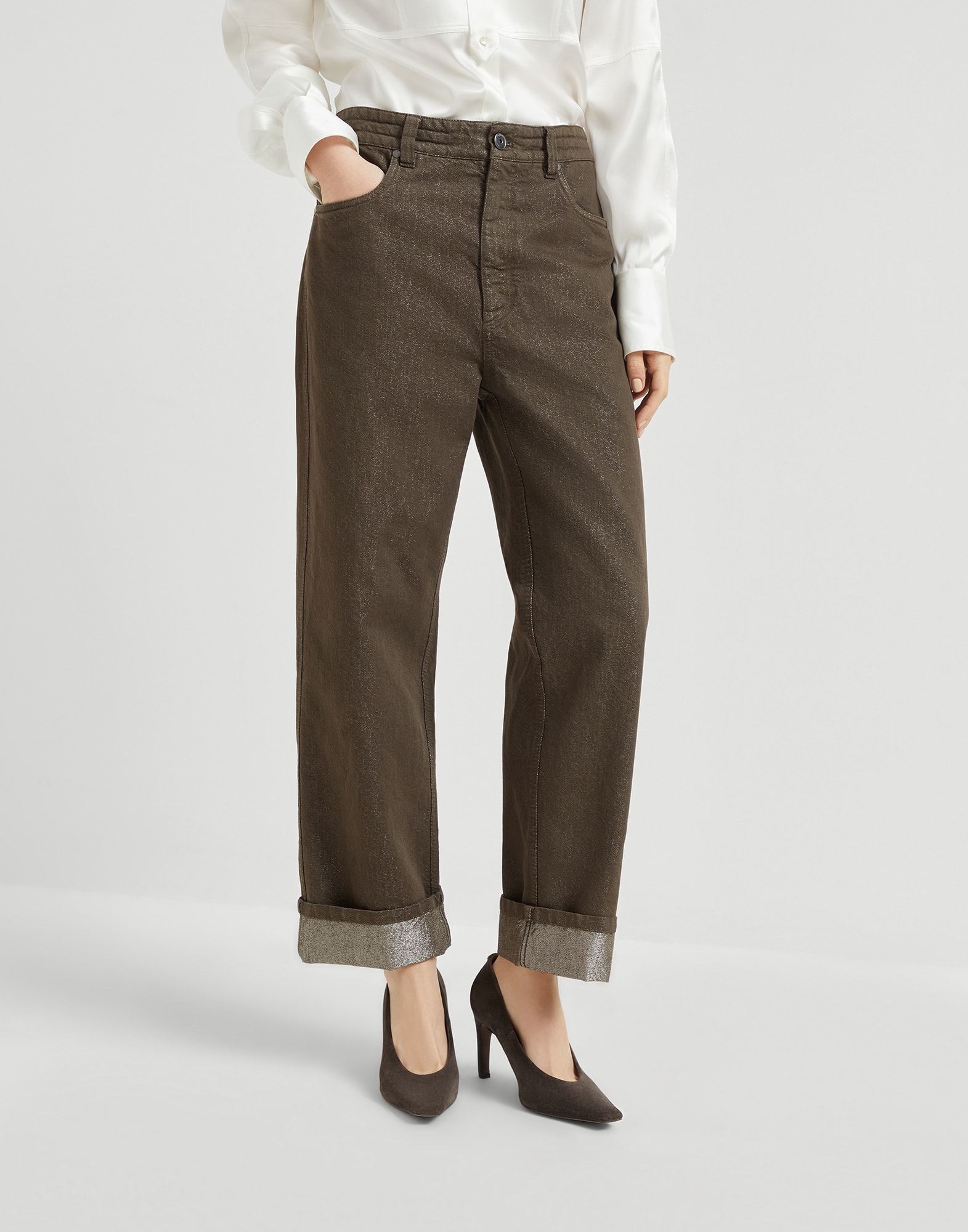 The casual style of these trousers perfectly complements the feminine look of dyed sparkling denim. The garment features soft, comfortable volume that falls straight down the leg, completed by a cotton drawstring that can adjust the fit. The cuffs at the bottom and the construction of the back pockets allow the sheen of the fabric to be appreciated. A shiny monili embroidery on the rear belt loop adds a sparkling note in true Brunello Cucinelli style.