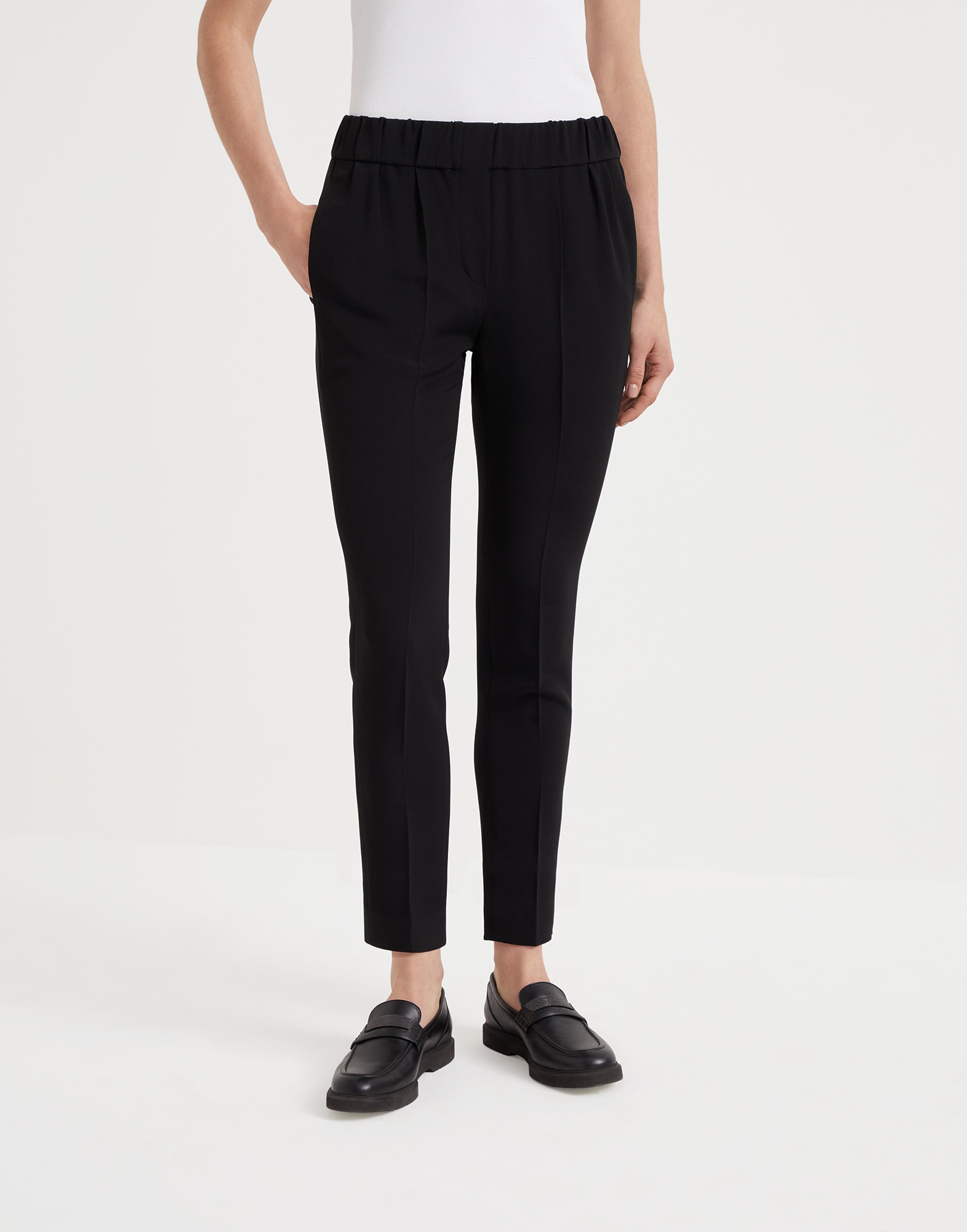 Silk and acetate crêpe cady fabric provides a fluid and sophisticated touch to the essential lines of these Tailored Jogger trousers. The regular fit is enhanced by the small pleats that complement the soft proportions in the seat and the regular cut down the leg. The elastic waistband reflects the characteristic silhouette of sporty trousers.