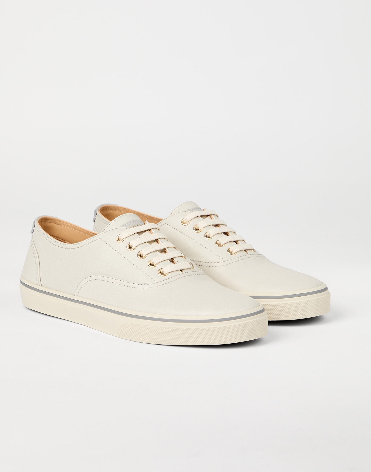 An iconic style of the Brunello Cucinelli collections, these casual sneakers are updated every season with refined leathers and colors. The rich texture of calfskin stands out in the stitching details and the contrasting accents. The flexible rubber bottom provides added comfort.