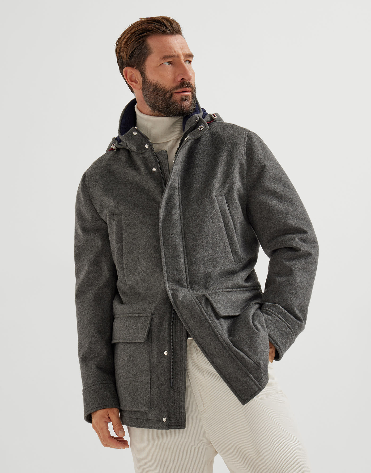 全新的Brunello Cucinelli珍贵羊绒海狸面料突出经典派克外套的运动风格。精湛的工艺营造出手感极致松柔的保暖面料,而轻盈的60 HL Thermore®填充材料则创造出舒适温暖效果,令外套成为冬季不可或缺的单品。领子和风帽内层镶嵌的羊绒编织物也为外套添增一份高贵。