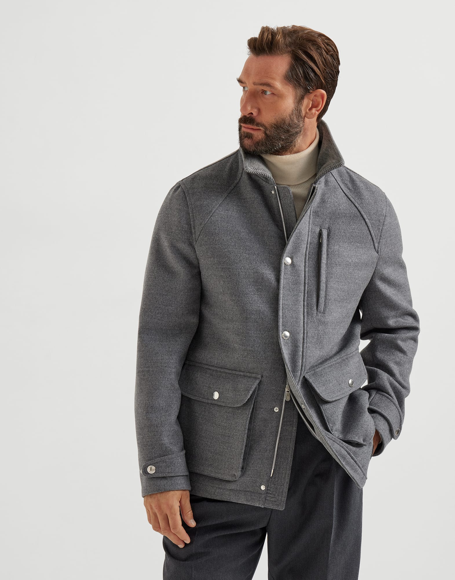 精美材质与匠心工艺相融合,为这款双面法兰绒野战夹克注入精致格调,焕新诠释休闲风范。纯羊毛纤维令柔软面料兼具保暖与轻盈触感,双面织造工艺提升利落轮廓与细致结构。标准版型设计,辅以衬衫式衣领与翻盖口袋等标志细节,塑造简约而富层次的造型表现。